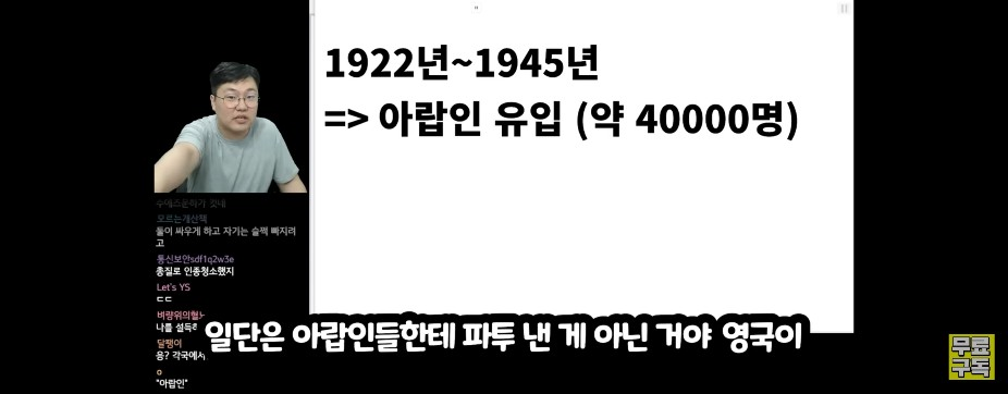 본래 이스라엘땅에 살던 팔레스타인 사람들이 대부분이였으나...오스만투르크 영향권에 있던 아랍인들도 영국과의 약속을 받아내어 팔레스타인 사람들이 살던 팔레스타인지구에 들어오기 시작했다. 1922년에서 45년 사이에 약 4만명..그후에 몇십만명이 계속해서 들어와서 ....당연히 똑같이 많이 들어오던 유대인들과 부딪히는 것은 시간문제였다.